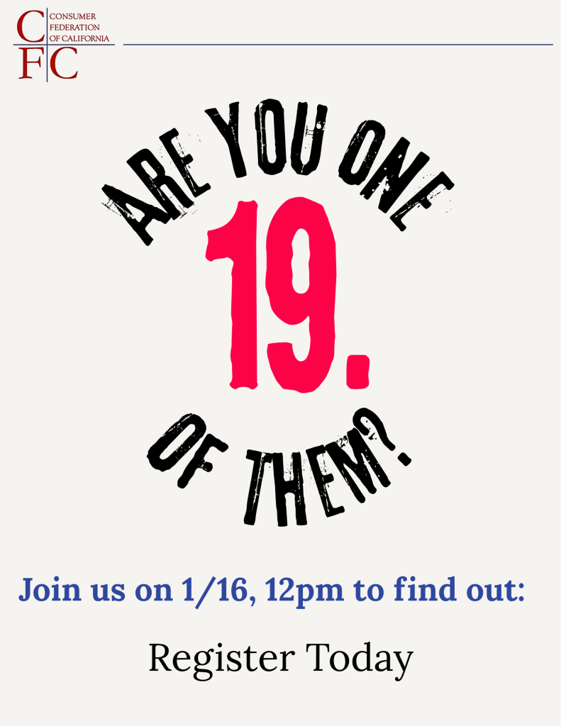 The Consumer Federation of California (CFC) is leading an educational campaign titled, “19. Are You One of Them?” This campaign highlights the extreme concentration of wealth and market power among the 19 richest American households. In America we now have unfettered wealth accumulation by a select few, destroying innovation and exacerbating income inequality both domestically and globally. CFC will showcase how monopolists, oligarchs and a handful of billionaires are driving the affordability crisis crippling the average American family.